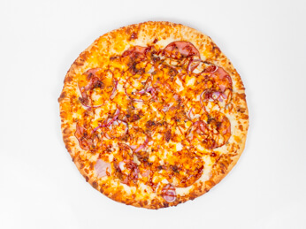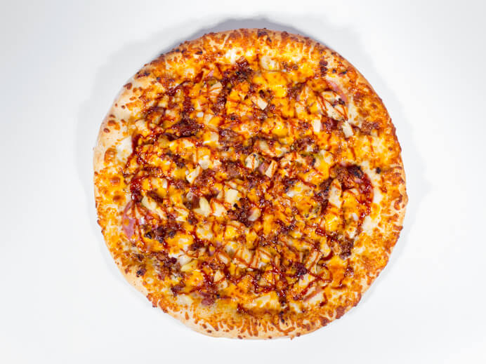 Ham, Chicken, Bacon, Pineapple, Cheddar and Mozzarella Cheese Topped with BBQ Sauce