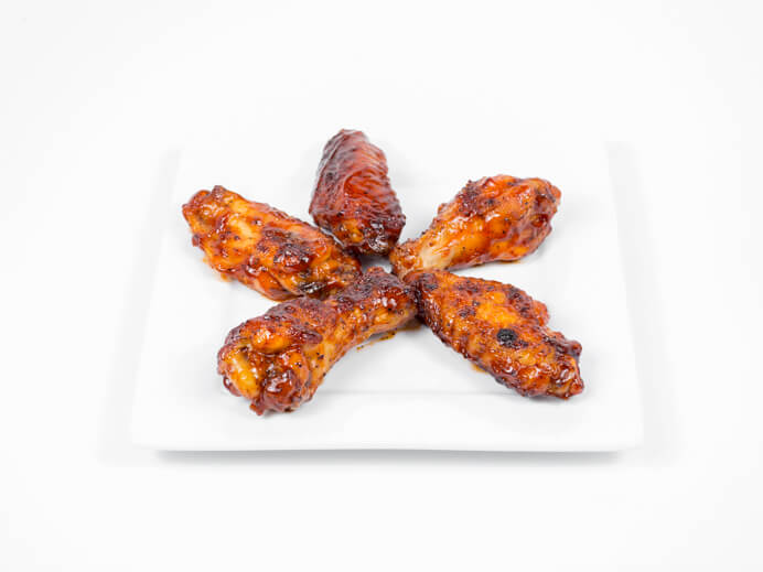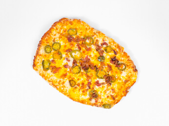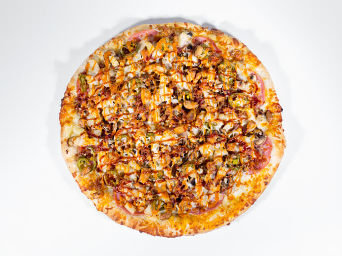 Ham, Chicken, Bacon, Pineapple, Provolone, Jalapenos, Mushrooms, Roasted Garlic and Mozzarella Cheese. Sauces: Buffalo Mustard, BBQ