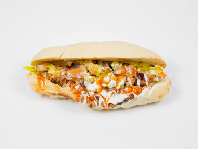 Buffalo Sauce, Ranch, Chicken, Banana Peppers, Provolone and Baked.