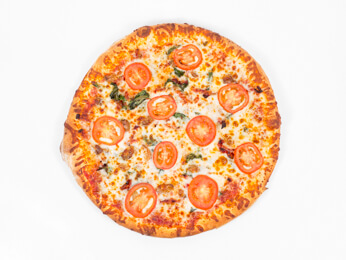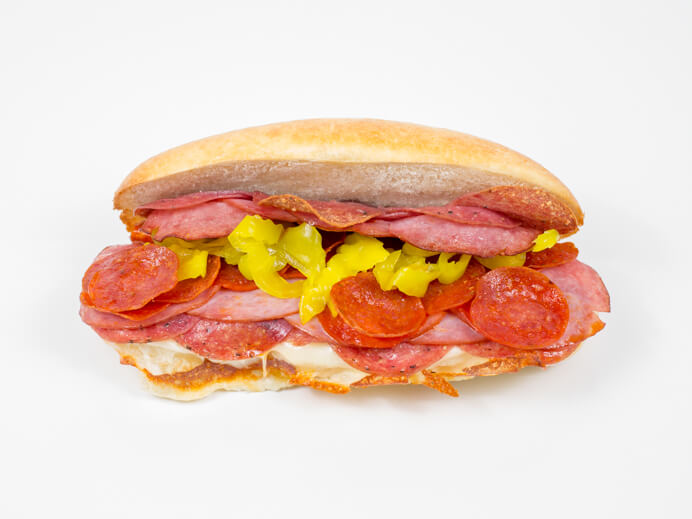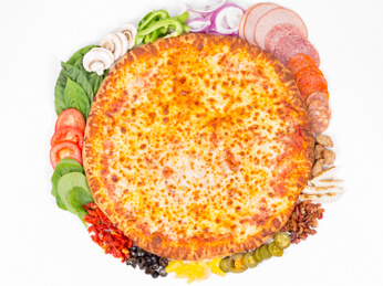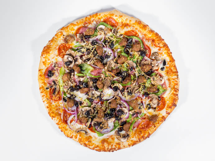 Mozzarella, Ham, Pepperoni, Green Pepper, Tomatoes, Black Olives, Red Onion, Banana Peppers and Croutons.
