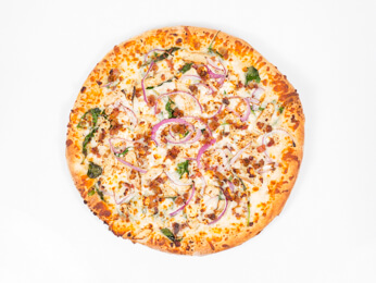 Ranch, Ham, Chicken, Bacon, Red Onions, Cheddar and Mozzarella Cheese Topped with BBQ Sauce