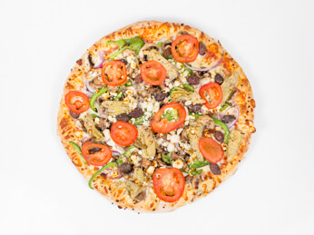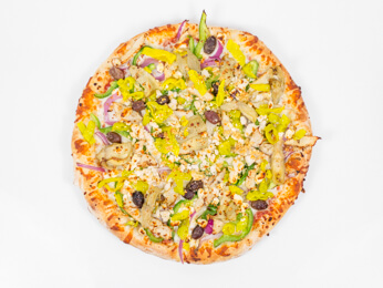 Pizza Sauce, Mozzarella, Feta, Regular Crust, Garlic, Chicken, Banana Peppers, Onion, Kalamata Olives, Artichokes and Green Peppers.