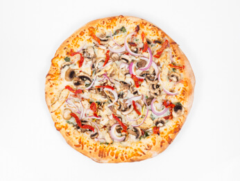 Onions, Pepperoni, Sausage, Black Olives, Mushrooms, Parmesan Cheese, Basil, Roasted Garlic, Sundried Tomatos