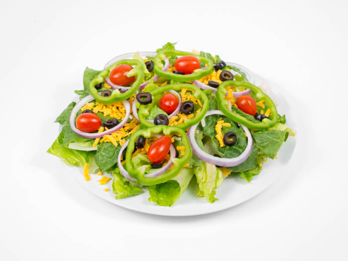 Cheddar, Green Pepper, Tomatoes, Black Olives, Red Onion and Croutons.