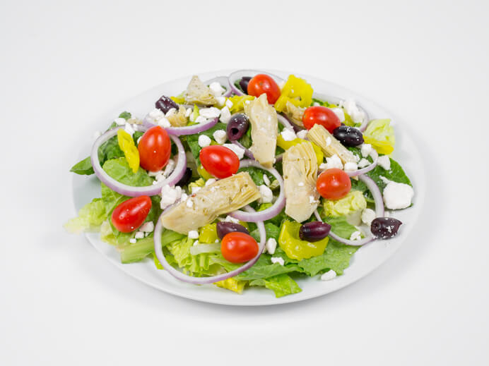 Red Onion, Feta, Banana Peppers, Artichokes, Kalamata Olives, Croutons and Tomatoes.