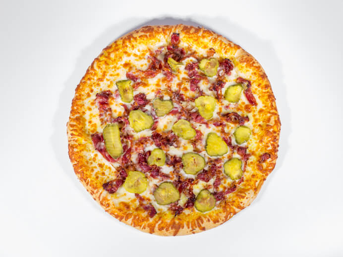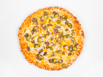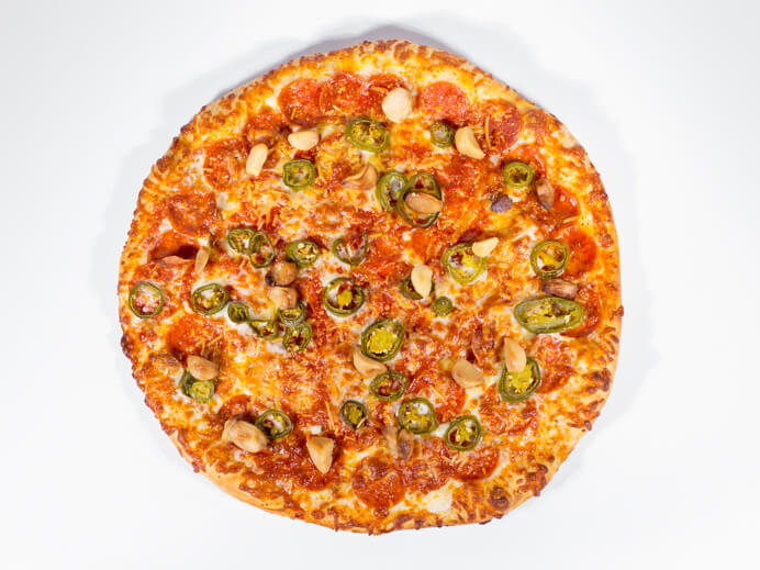 Extra Pepperoni, Jalapenos, Roasted Garlic, Sriracha Sauce, Mozzarella, Parmesan and Provolone Cheese