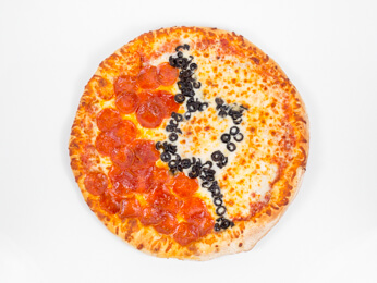 Pokeball Pizza with Half Pepperoni, Half Cheese and Black Olives to form the Pokeball Look